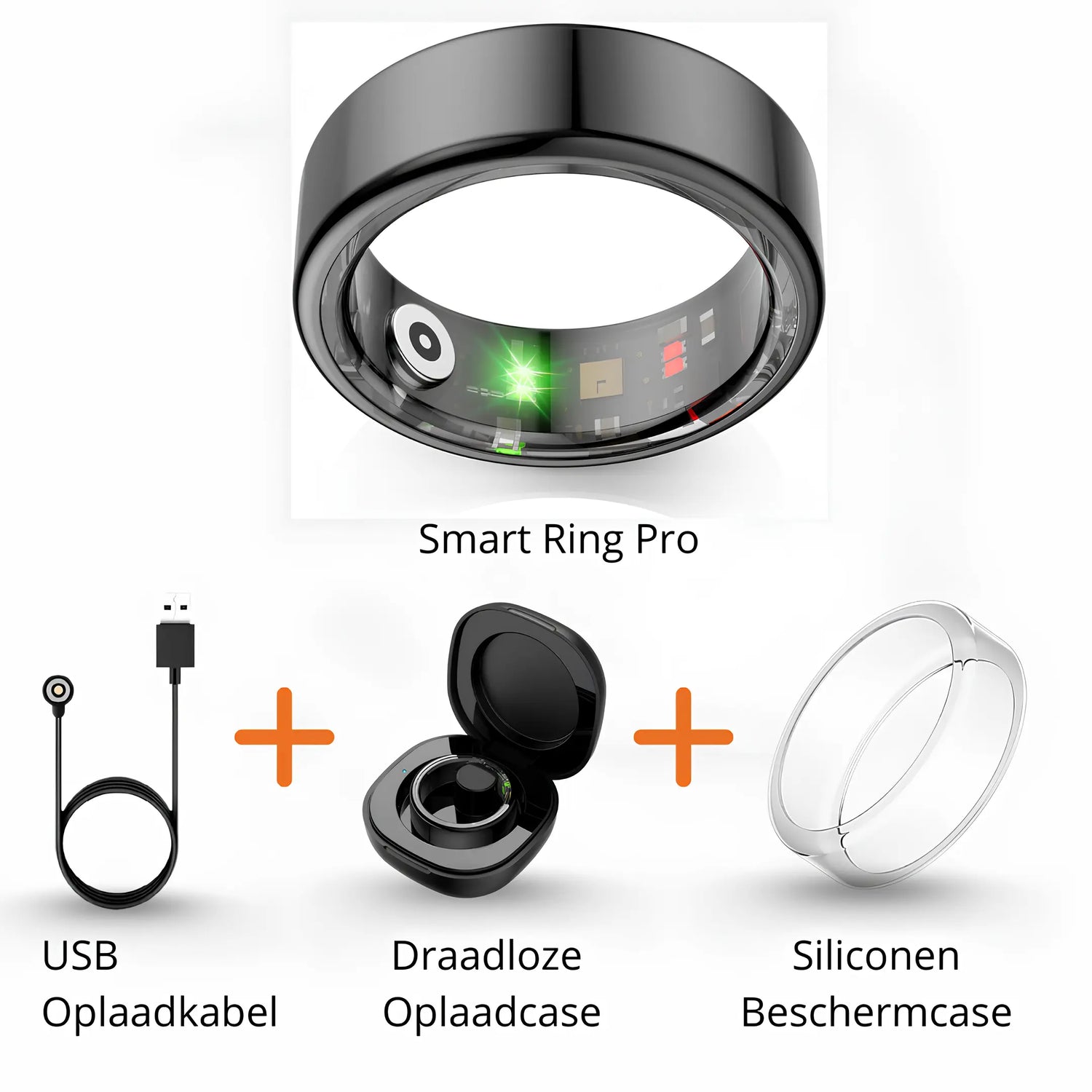 De Smart Ring Pro wordt compleet geleverd. Inclusief een USB oplaadkabel, draadloze oplaadcase en een Nederlandse handleiding. Open de doos, laad op en begin direct met het volgen van je activiteiten en gezondheid!